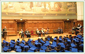 Тем, кто сдал экзамен (а это чертовски трудно, так как французы - педанты, считают каждый аксант эгю (это черточка над буквой "е"), и у них строгий стиль письма (о-ля-ля, это вырабатывалось столетиями и менять они ничего не меняют), выдали заранее наши тоги (мантии) и шапочки с кисточками и обязали придти всем за 45 мин до начала церемонии. Где-то за месяц до окончания учебы нам объявили , что впервые (!) зал Ришелье откроют перед студентами (да еще и иностранцами), поскольку раньше там могли заседать исключительно академики и выступать президенты государств и премьер-министры. Были приглашены посольские (нескольких государств), а всего нас в выпуске было представителей 150 государств. Хи-хи, таких почестей я даже не ожидала, как говорится, это я удачно зашел...))))