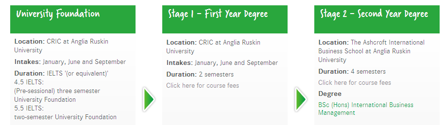 Из представленных здесь колледжей Навитас самый короткий путь к получению степени бакалавра с отличием в области управления международным бизнесом (BSc (Hons) International Business Management) предлагает Cambridge Ruskin International College (CRIC). Это происходит не за счет сокращения каких-то академических дисциплин, а из-за спрессованности учебных семестров. Тем, кто выберет эту программу, придется учиться последние 1,5 курса практически без каникул, но таким образом они сэкономят значительные средства на стоимости обучения и расходах на проживание. Схематически это выглядит следующим образом: