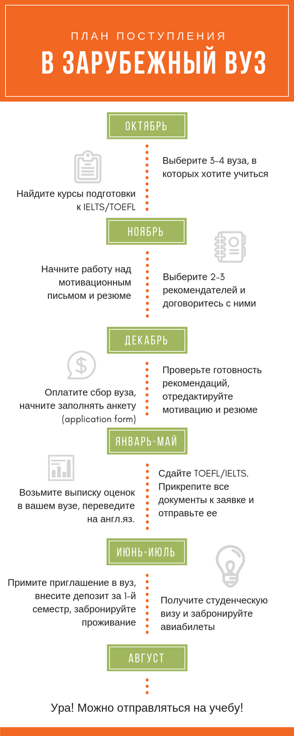 Когда начинать поступление в зарубежный вуз? Что вообще для этого нужно? Чтобы помочь в решении этих вопросов, которыми задаются все абитуриенты зарубежных вузов, мы разработали удобный план в виде инфографики. План включает в себя все шаги, которые нужно предпринять на пути поступления в зарубежный колледж или университет, их порядок и временные указатели, чтобы вы все сделали вовремя.