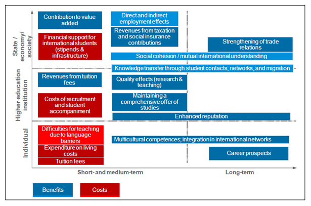 Германская служба академических обменов (DAAD) провела исследование с амбициозной целью установить размер экономического вклада и социально-политического влияния, как следствие обучения международных студентов за границей. Главное заключение – это то, что затраченные расходы на обучение иностранных студентов окупаются на протяжении лет и поэтому постараться удержать иностранных студентов в стране было бы более выгодно принимающей стране, нежели стремление ограничить их пребывание после окончания учёбы. С другой стороны, обучение за рубежом ведёт и к международному сотрудничеству на социально-политическом и экономическом уровнях.Исследование было проведено в Германии, Австрии, Польше, Швейцарии и Испании. Методология включила изучение таких аспектов как: