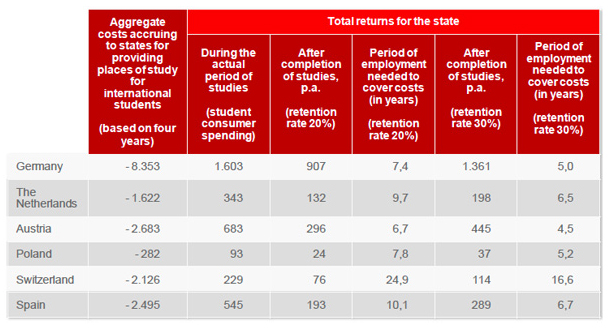 Таблица 2: «Расходы на содержание международных студентов, расходы международных студентов и доход о тех студентов, кто остался после окончания обучения (20-30%)». Источник: Prognos AG 2013
