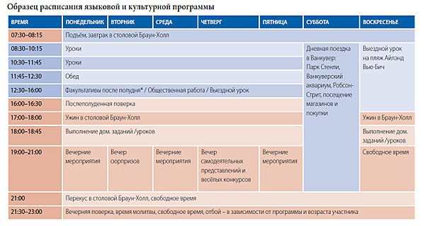 - 20–25 часов в неделю формального обучения английскому языку, с понедельника по пятницу